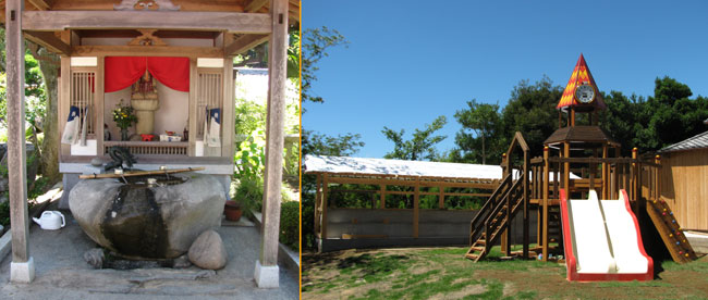 阿弥陀様・観音様・お地蔵様に見守られ、元気に外で遊ぶ楽しさを念頭に掲げ、安全に遊んでいただけるように、巨大木製遊具にしました。従来道理トランポリンもそのまま遊んでいただけます。