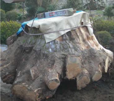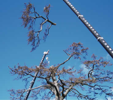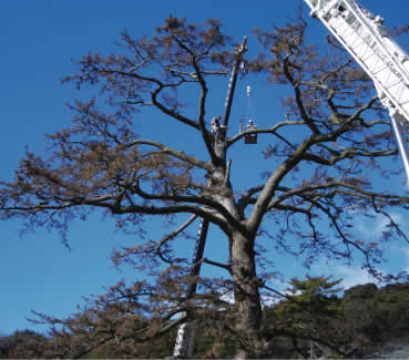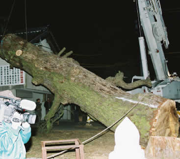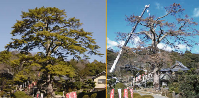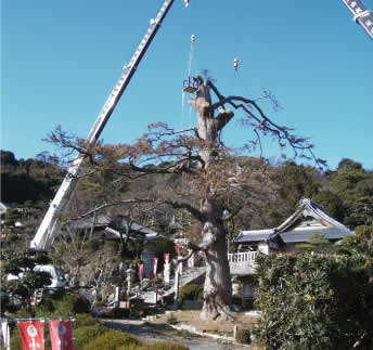 しかし、平成16年11月頃から松食い虫の影響により葉が茶色くなり、平成17年11月頃から枝が折れはじめ、危険と判断されたため、當山ではやむなく伐採に踏み切りました。